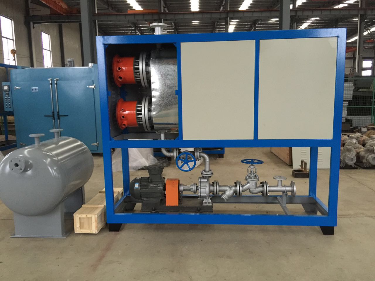 導(dǎo)熱油爐排氣流程: 1、導(dǎo)熱油通過膨脹槽注油口處加注,并通過膨脹口管道流入設(shè)備及油爐本體內(nèi),此時(shí)注油時(shí)一定要打開系統(tǒng)中所有的閥門(放油閥除外),讓導(dǎo)熱油流入筒體及需加熱設(shè)備內(nèi)。 2、當(dāng)液面顯示約為膨脹槽高度1/2時(shí),停止注油。 3、首 行常溫排氣:接通電源,打開導(dǎo)熱油加熱器的進(jìn)出口閥門及排氣閥(膨脹管道閥門需一直開著以及時(shí)補(bǔ)充油量),按動油泵啟動按鈕,油泵運(yùn)行,油泵應(yīng)按箭頭指示方向正常運(yùn)行,壓力表壓力顯示在規(guī)定范圍內(nèi),視聽油泵運(yùn)行情況,如有異常現(xiàn)象應(yīng)立即停機(jī)檢查,將故障排除后再重新起動油泵,進(jìn)行常溫下排氣,直至壓力表指示穩(wěn)定。進(jìn)行常溫排氣時(shí),要注意觀察膨脹槽內(nèi)的液位,當(dāng)?shù)陀谝?guī)定的液位高度時(shí)要及時(shí)進(jìn)行補(bǔ)充。 4、升溫脫水:在確認(rèn)常溫下運(yùn)行正常后,即可進(jìn)行升溫脫水排氣(操作前詳閱導(dǎo)熱油使用說明書及溫控儀使用說明書),升溫脫水排氣可按如下步驟進(jìn)行: 步:升溫至100-120℃保溫 開始升溫時(shí),應(yīng)該控制升溫速度在50℃/h以內(nèi),并且監(jiān)視壓力表顯示是否正常,如發(fā)現(xiàn)無壓力或壓力不穩(wěn),說明系統(tǒng)內(nèi)仍有殘留氣體,此時(shí)要求按3要求重復(fù)進(jìn)行常溫排氣操作,待系統(tǒng)壓力穩(wěn)定后方可繼續(xù),升溫至120℃后進(jìn)行長時(shí)間保溫,保溫時(shí)間的長短與系統(tǒng)總?cè)萘考皩?dǎo)熱油的質(zhì)量有關(guān)。  第二步:升溫至150-180℃保溫。  排除油中輕組分、揮發(fā)物及殘余水分,請參照KRD系列導(dǎo)熱油加熱器系統(tǒng)脫水排氣曲線圖操作 第三步:脫水排氣完成后要關(guān)閉排氣閥(其它閥門無需關(guān)閉),投入正常升溫運(yùn)行。 5、 升溫脫水排氣過程有關(guān)事項(xiàng)。 升溫過程中管路可能會發(fā)出碰擊的響聲,說明系統(tǒng)內(nèi)有大量氣體或管道不暢,此時(shí)要降低升溫速度,待氣體排除便可消除聲響;如系管道不暢所至應(yīng)予以排除。 脫水排氣過程可能會有大量氣體涌入膨脹槽,造成槽內(nèi)導(dǎo)熱油外溢,操作前要在溢油管下安置好溢油容器。 進(jìn)行脫水排氣時(shí),現(xiàn)場必須有人員看守,發(fā)現(xiàn)異常及時(shí)處理。   對于所提的油泵無油或少許油流出的問題,解決方案如下: 1、 關(guān)閉出油口閥門,啟動油泵,觀察壓力表顯示情況,若無壓力,則說明回油口無油補(bǔ)充油泵,使得油泵空轉(zhuǎn),無后續(xù)油及時(shí)補(bǔ)充,則請貴司檢查一下回油口的供油情況,此時(shí)請確保膨脹槽里有油并膨脹管道閥門打開和需熱設(shè)備有油并出油口閥門在打開狀態(tài)。 2、 如果以上要求都執(zhí)行到位,壓力表還無壓力,請檢查油爐上的油泵、截止閥及過濾器是否堵塞。 3、 若壓力表顯示壓力值,而油泵、截止閥及過濾器并無堵塞,那油爐的出油口一定會按油泵所提供的流量進(jìn)行流出。